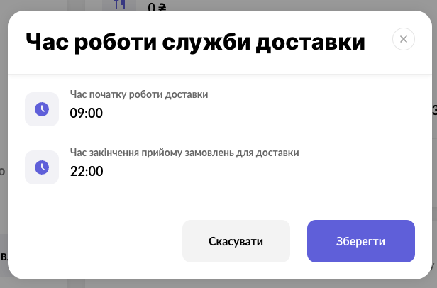 - У вікні вкажіть час початку роботи доставки, та час закінчення прийому замовлення для доставки