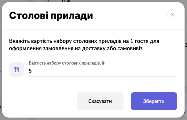 - Для зміни вартості набору натисніть на кнопку з іконкою “олівець” в рядку “Вартість набору столових приладів“