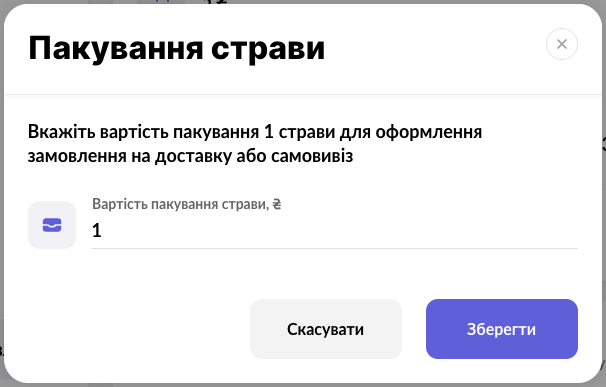 - У вікні вкажіть вартість пакування 1-ї страви
