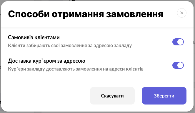 - У вікні активуйте потрібні способи отримання замовлення