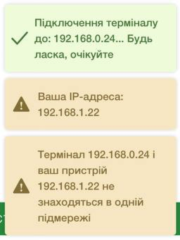 - Перевірте, щоб ваш банківський термінал та робочий пристрій були в одній мережі (підключені до одного роутера)