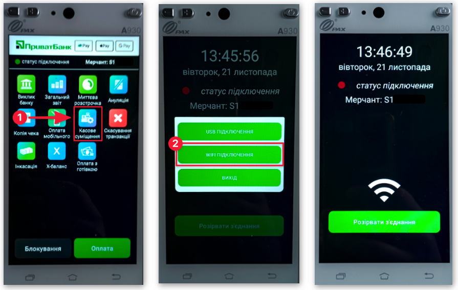 ❗ Суміщення між програмою SkyService та PAX A930 можлива лише, коли термінал у режимі суміщення (як на останньому фото).