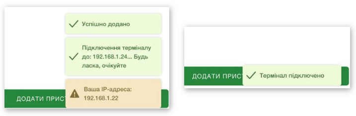 ☝🏻 Якщо термінал в режимі суміщення (див. пункт 1) і знаходиться в одній мережі з робочим пристроєм IOS, на якому встановлена програма SkyService, то після додавання налаштування, має виникнути повідомлення: