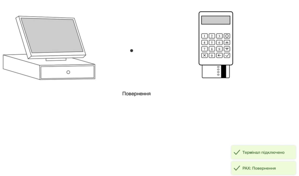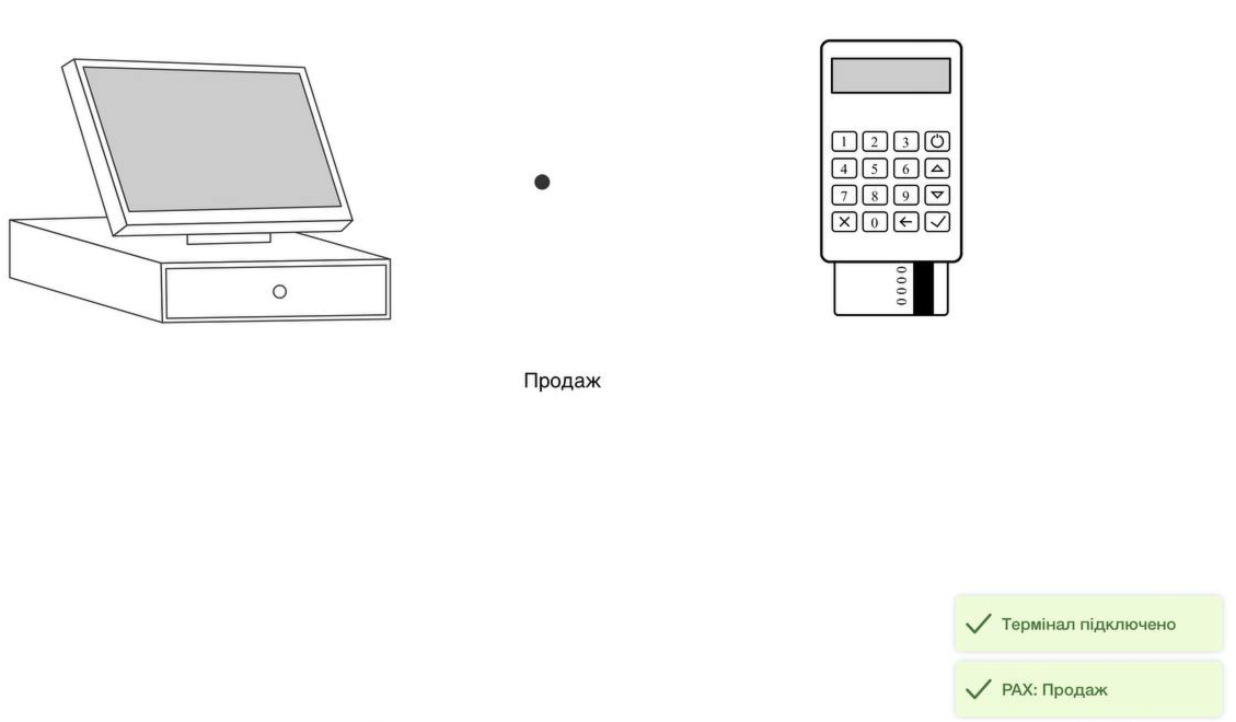 👉🏻 Сума продажу передається на термінал ➜ Клієнт прикладає картку ➜ Операція виконується на терміналі ➜ Закривається вікно зв’язку з терміналом у програмі