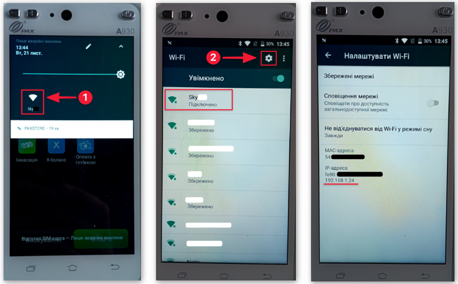 ☝🏻 Щоб перевірити IP-адресу PAX A930 у мережі, ви можете: