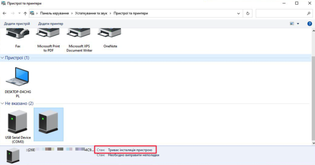 - Якщо драйвер на фіскальний реєстратор не встановлено, в Панелі керування на Windows “Стан: Триває інсталяція пристрою”: