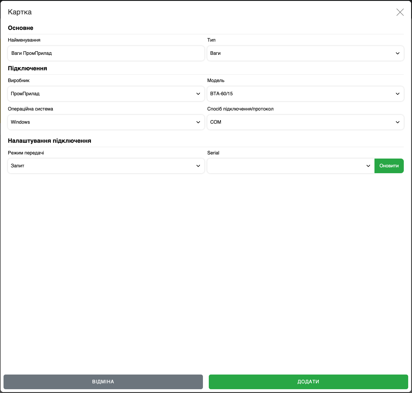 Підключення ваг у програмі SkyService