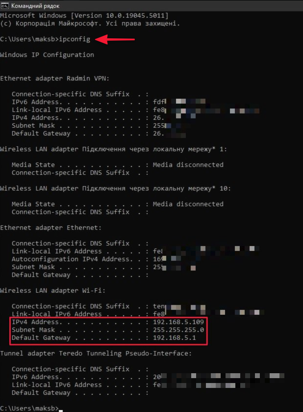 - У командному рядку напишіть ipconfig та натисніть Enter