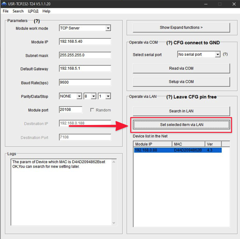 - Натисніть кнопку “Set selected item via Lan“