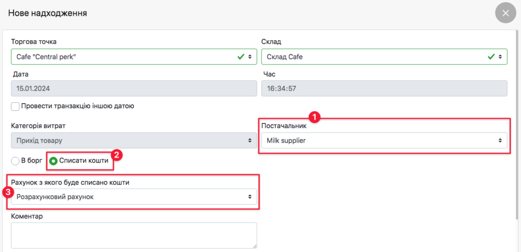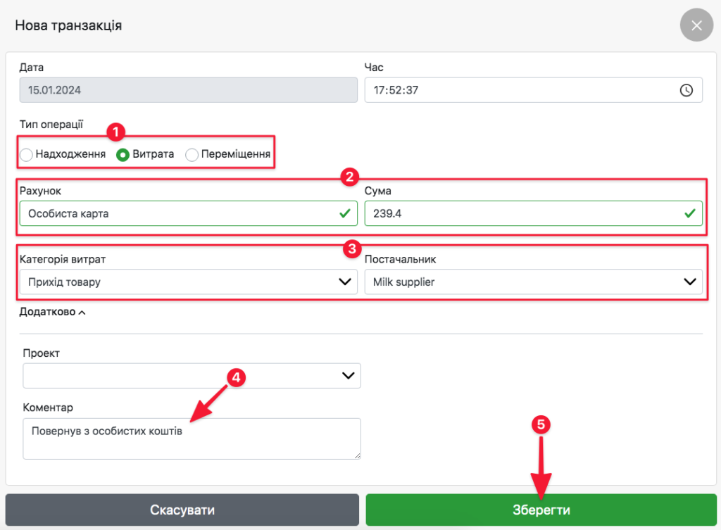 - Оберіть категорію витрат – Прихід товару (або іншу самостійно вами створену)