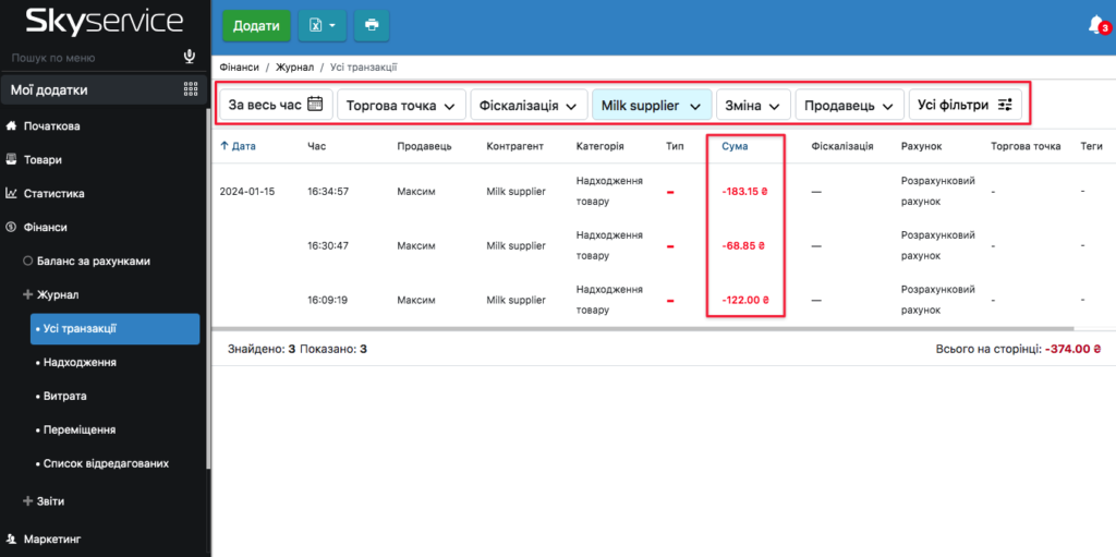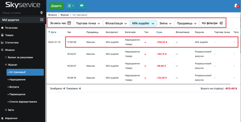 👉 Усі проведені транзакції розрахунку з Постачальником можете переглянути в пункті Фінанси → Журнал → Усі транзакції, обравши ідентичні фільтри.