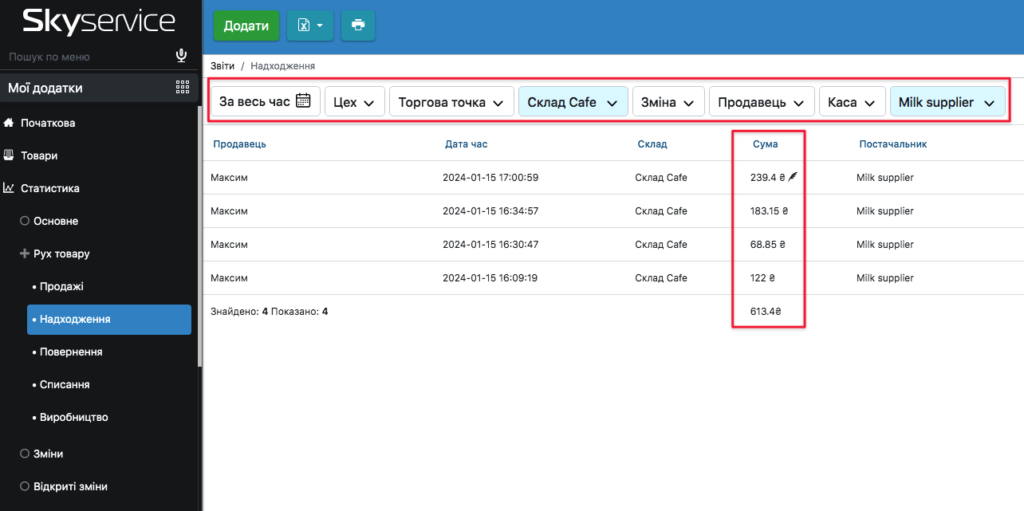 👉 Проведені документи Надходження товару, можна переглянути в пункті Статистика → Рух товару → Надходження. Оберіть у фільтрі Постачальника та можете переглянути усі документи, де його було вказано. Буде підрахована також загальна сума усіх документів (з урахуванням приходу товару в борг).