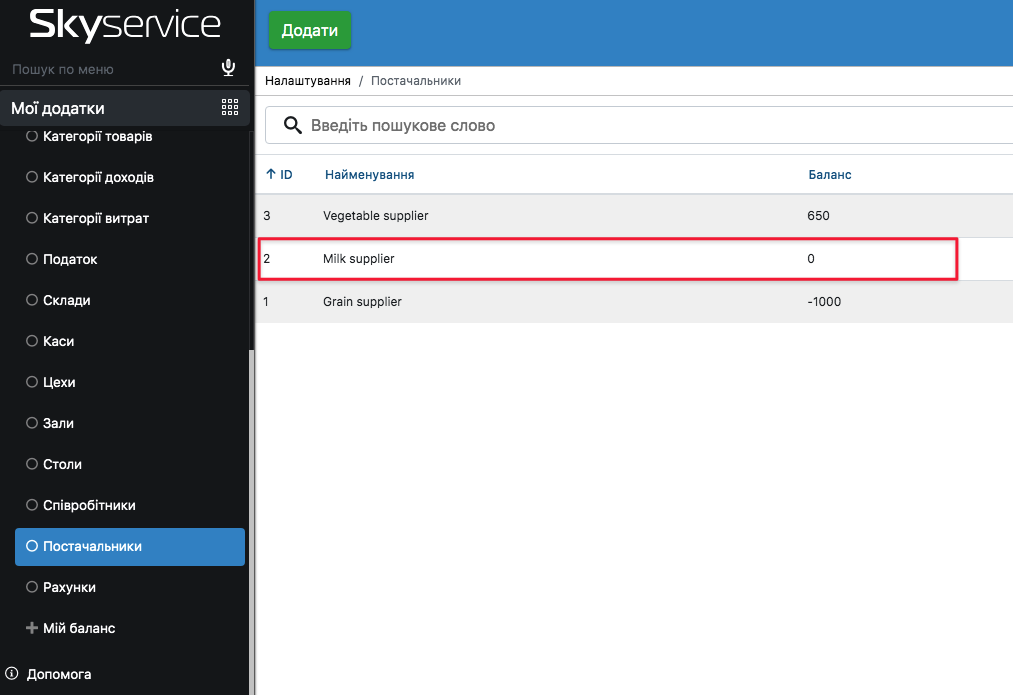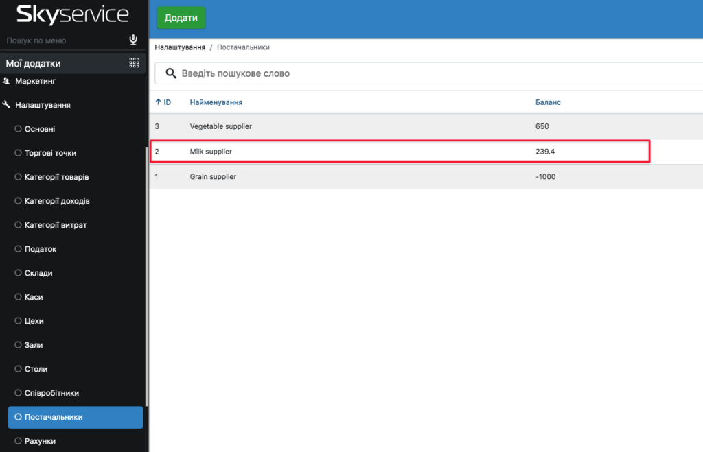 👉 Додатково можете відкрити пункт Налаштування → Постачальники, щоб точно пересвідчитись, що у вас немає перед ним заборгованості. Наявність певної суми на балансі постачальника, вказуватиме на вашу заборгованість перед ним у розмірі даної суми. Якщо сума зі знаком “мінус” – це показує на суму переплати (або передоплати) постачальнику.