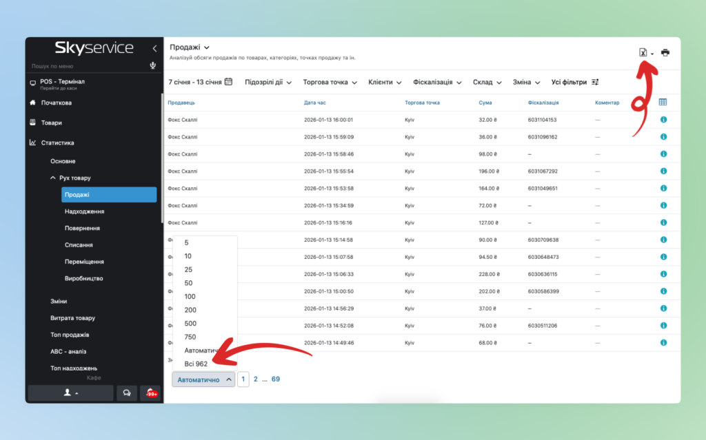 ☝️ Додатково рекомендуємо вивантажувати в межах 1000 продажів на сторінку. Понад 1000 документів в одну сторінку немає можливості вивантажувати.
