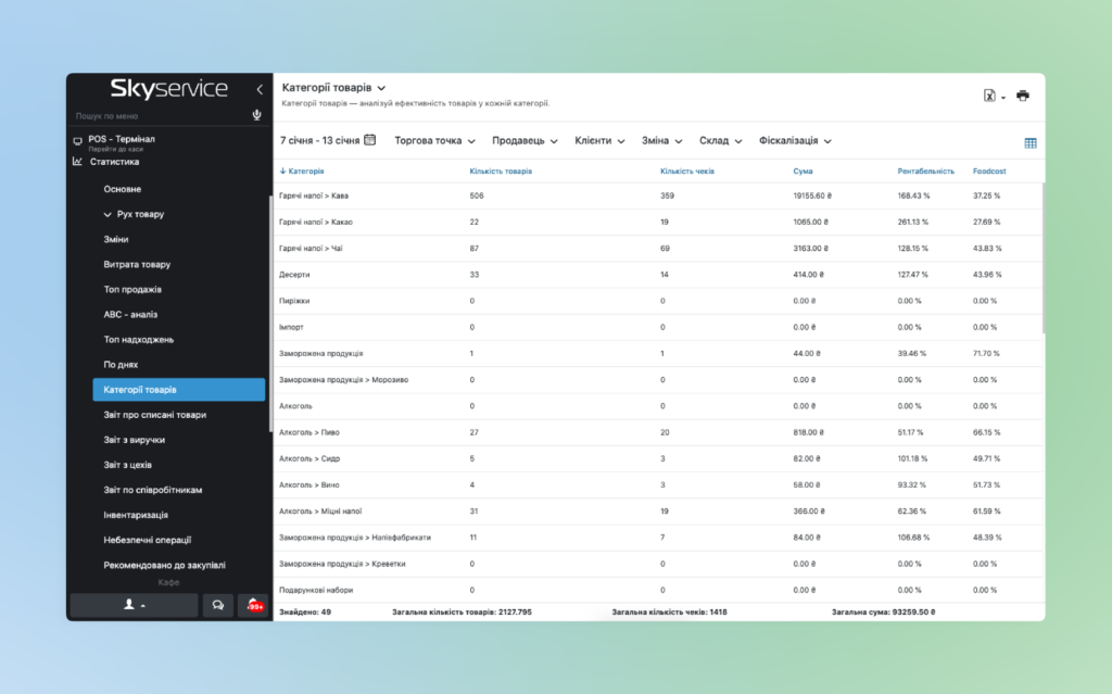 - Нижче буде відображатися список категорій товарів, в котрому можливо переглянути показники за кількістю проданого товару, кількості продажів, їх сумі та рентабельності.
