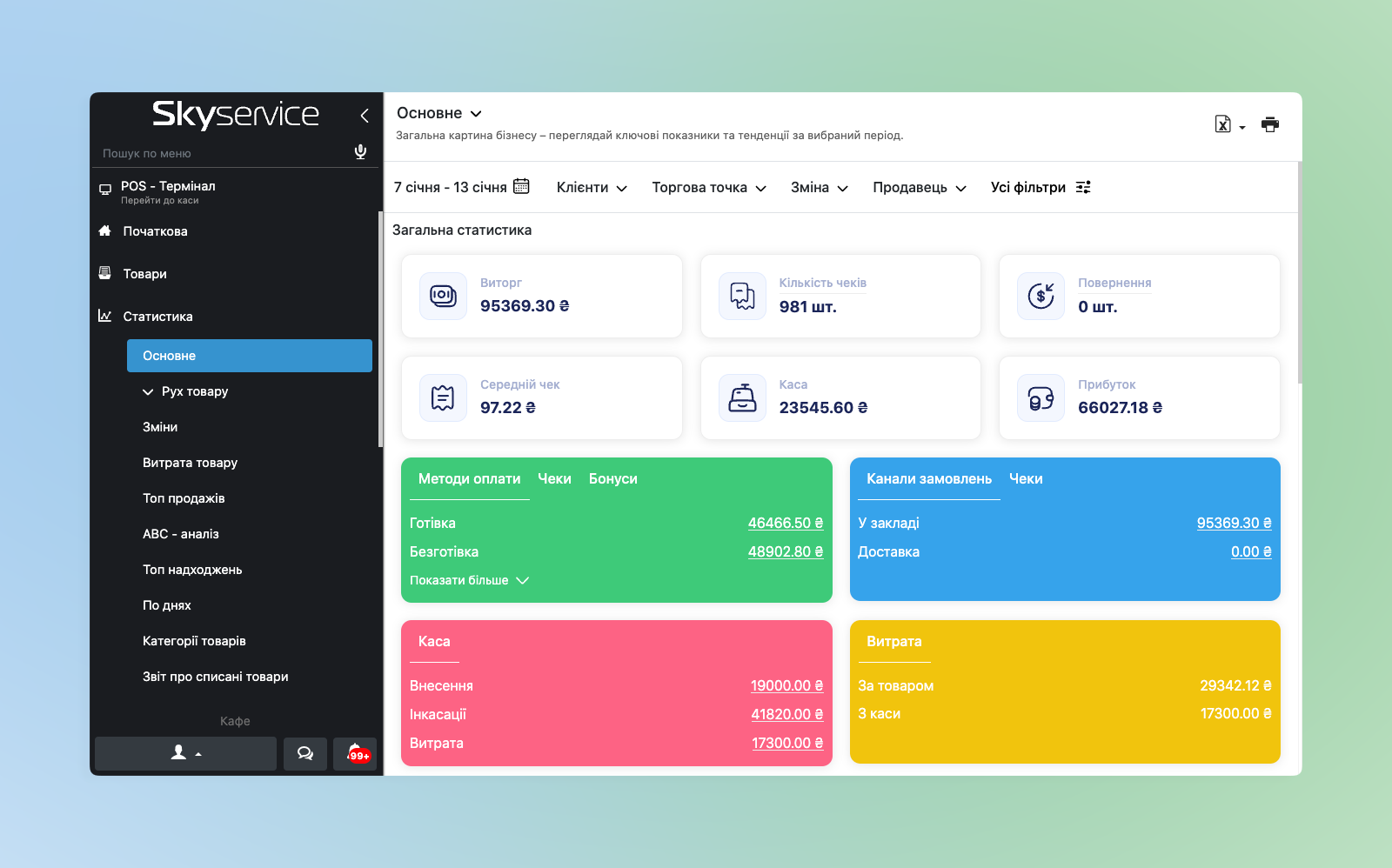 - Нижче будуть відображатися основні показники по продажах, касі, чекам тощо. Також прогорнувши до низу додатково спостерігаються статистичні діаграми.