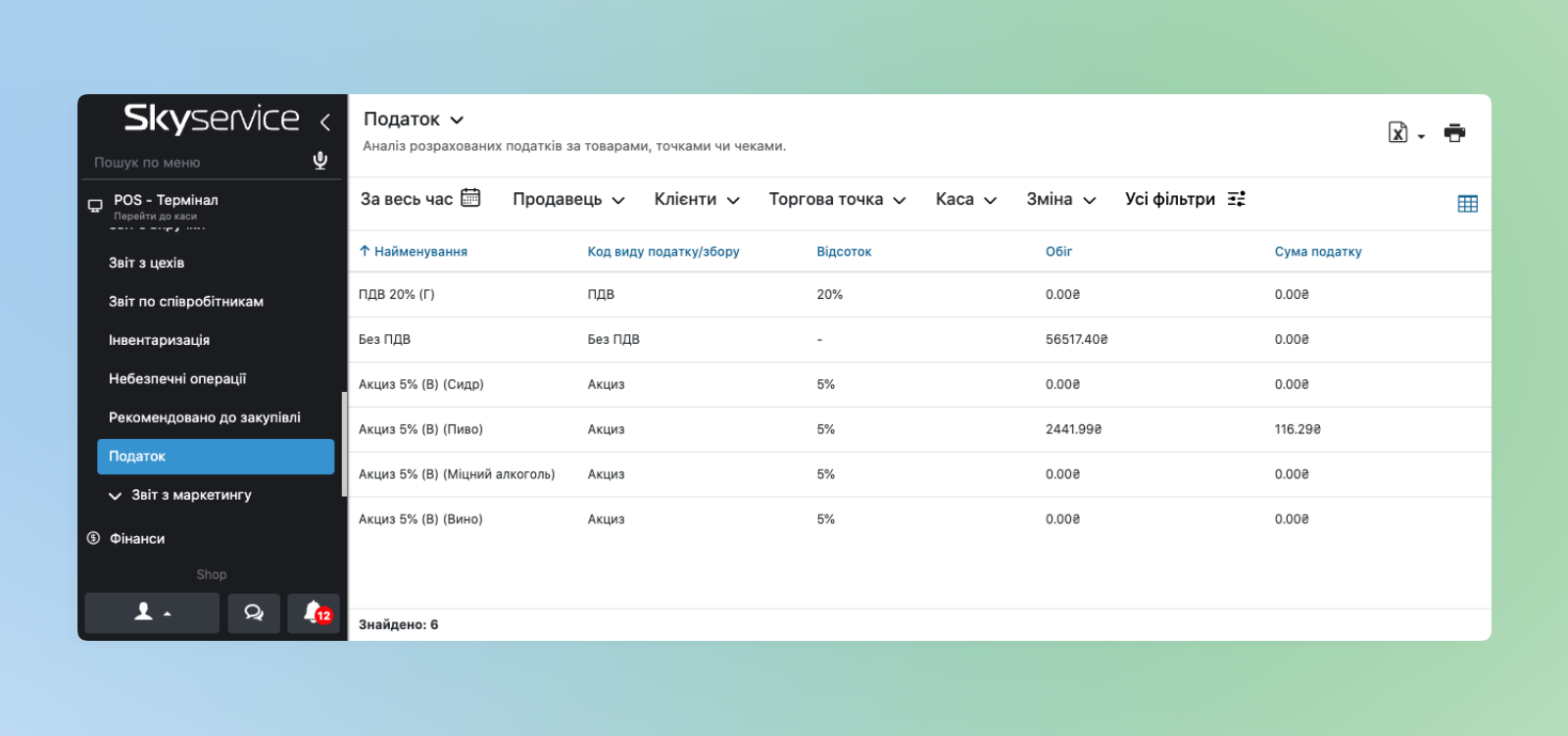 - Нижче буде відображатися список Податків із показниками сформованими з урахуванням фільтрації.