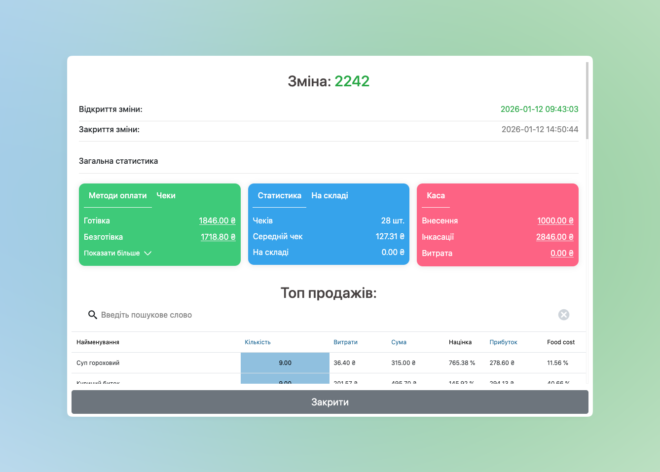 - Нижче буде відображатися список змін ➜ оберіть необхідну зміну натиснувши на неї та в її картці будуть відображатися показники по продажах, методам оплат, по котрим вони проходили, кількості чеків, середнього чека та також по касовим коштам