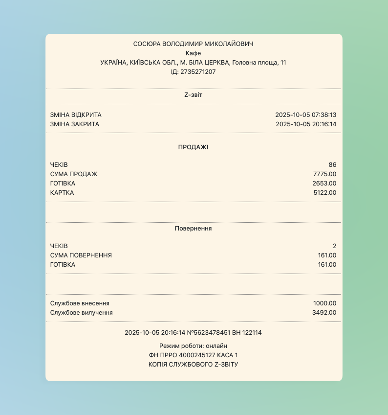 ☝️ Також зверніть увагу – якщо працюєте з програмним РРО, тобто фіскально – в картці зміни прогорніть до низу та будете спостерігати саме фіскальний z-звіт, котрий надходить в податкову. За необхідності при формуванні фіскальних звітів рекомендовано спиратися саме на даний звіт.