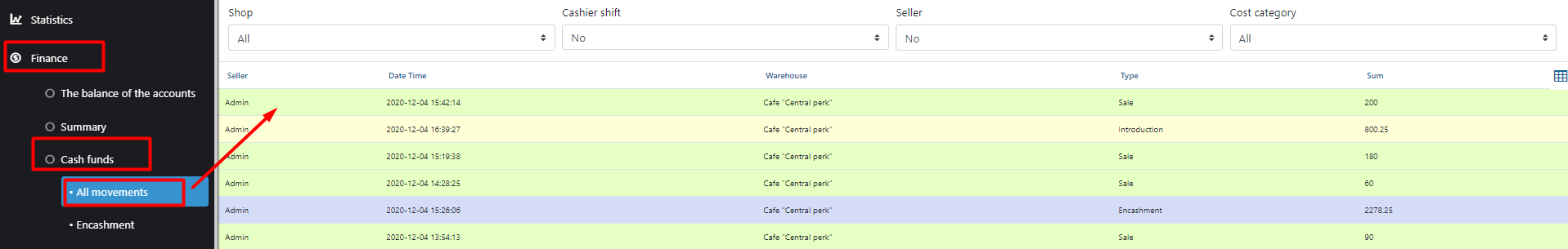 - 转到菜单 – 管理 – 财务 – 现金资金 – 所有动作。