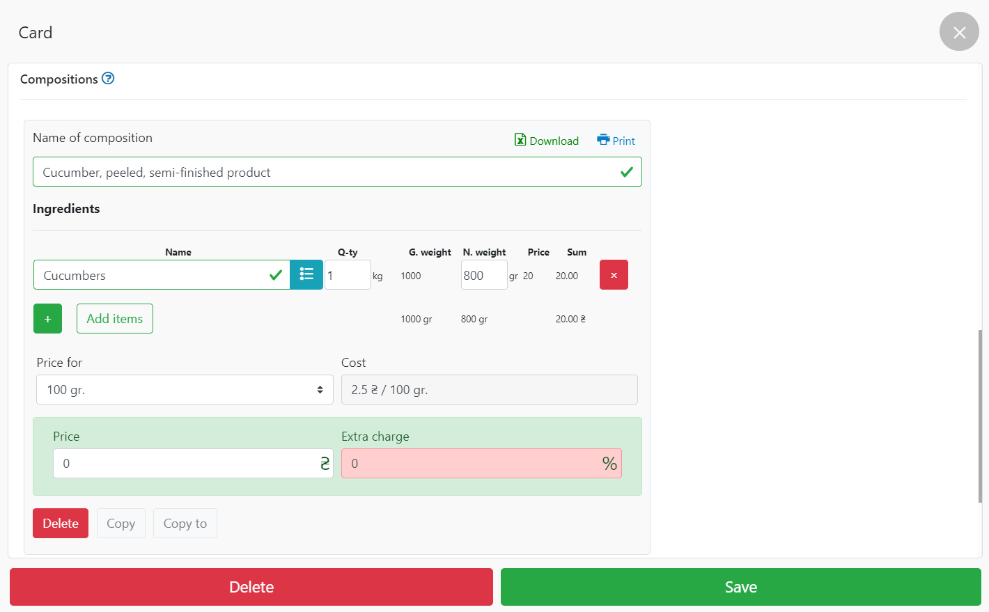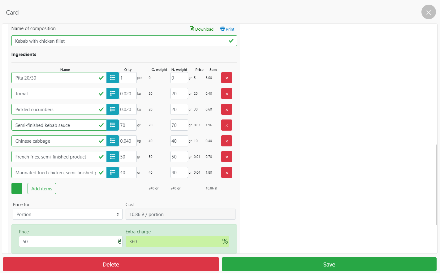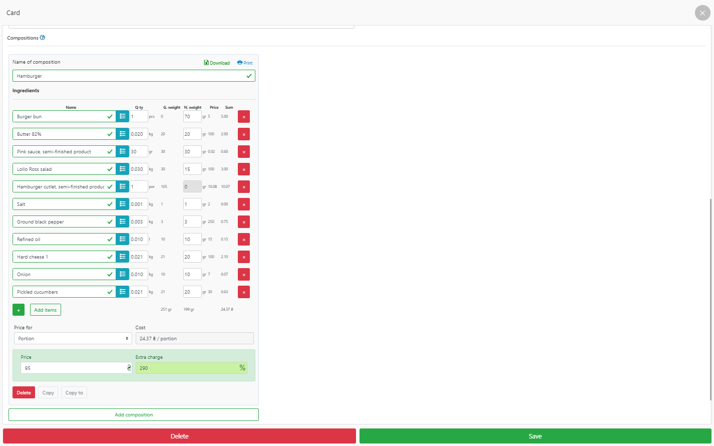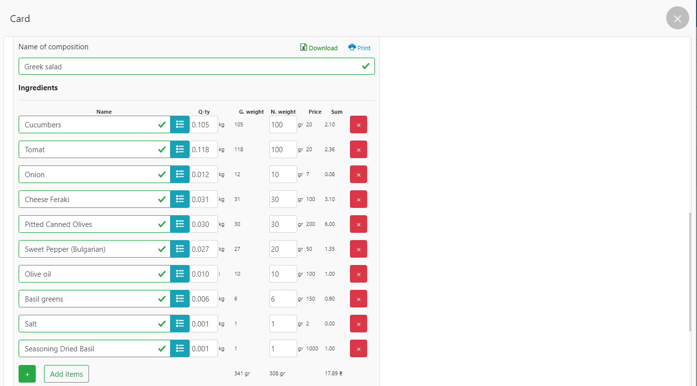 按照技术卡“希腊沙拉”的示例,您可以进行所有必要的计算。