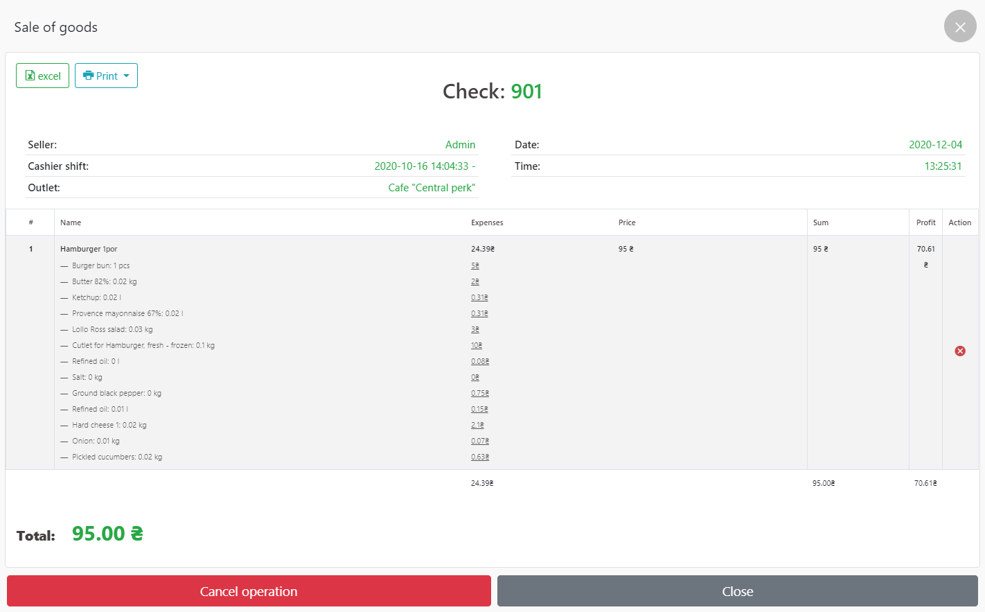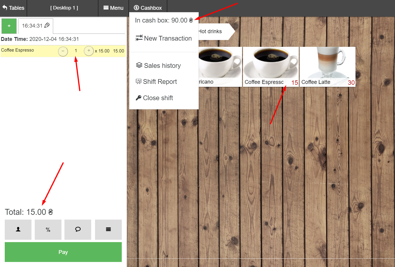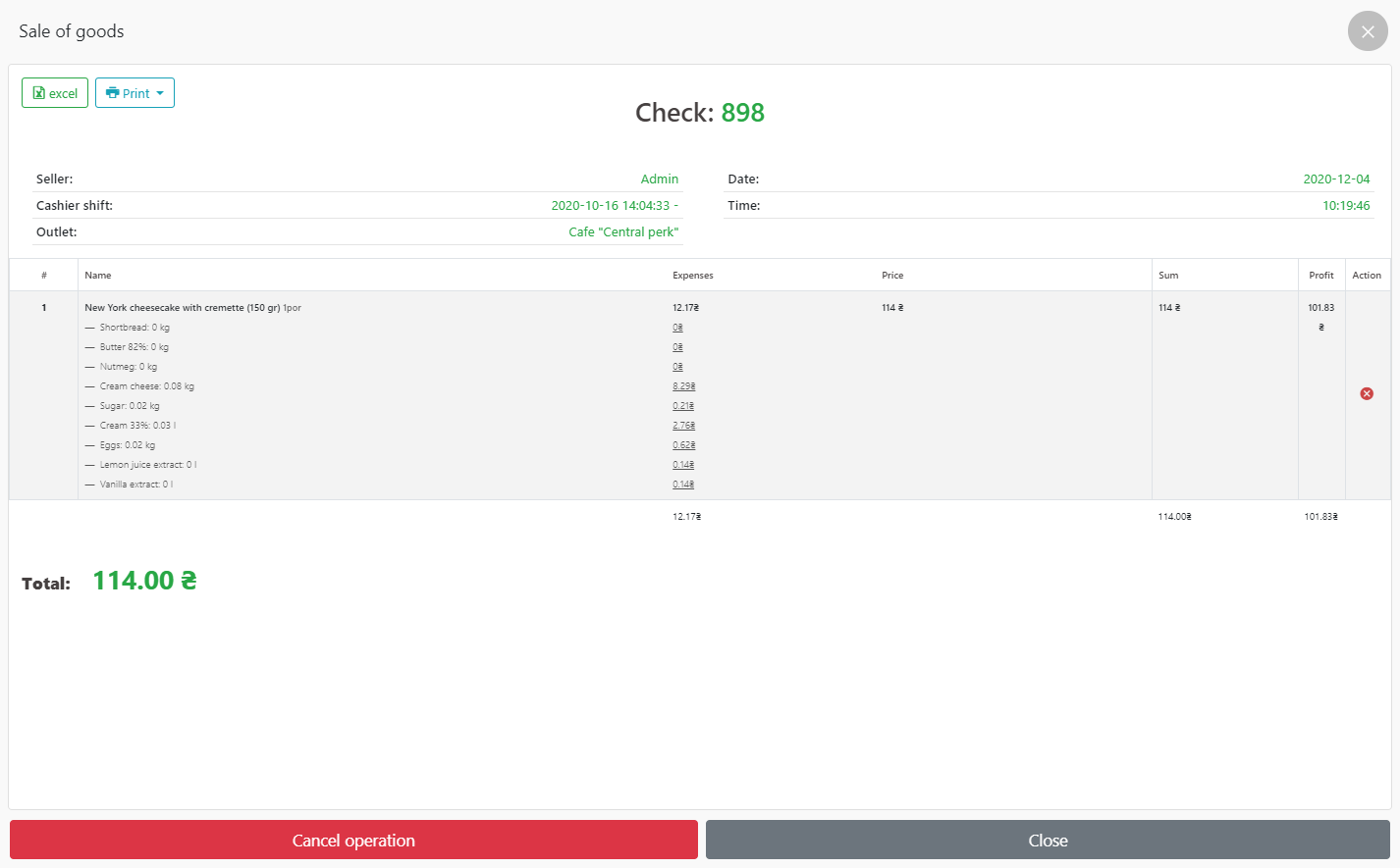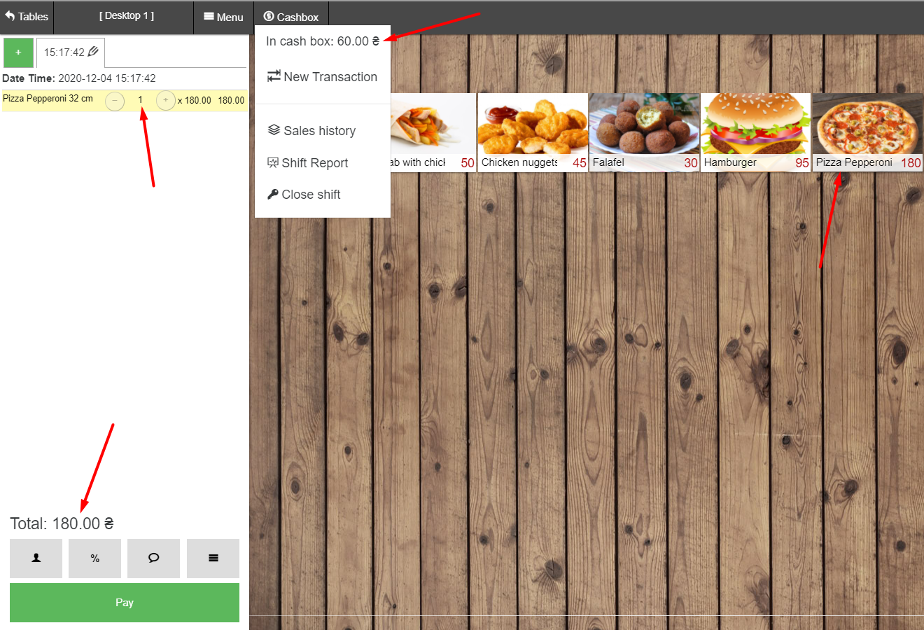 - 在 POS 终端中,我们在“厨房”类别中找到一道菜 – 子类别“甜点”并出售“纽约芝士蛋糕和奶油蛋糕”;