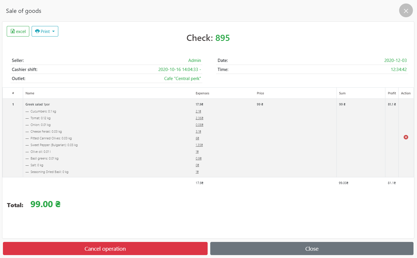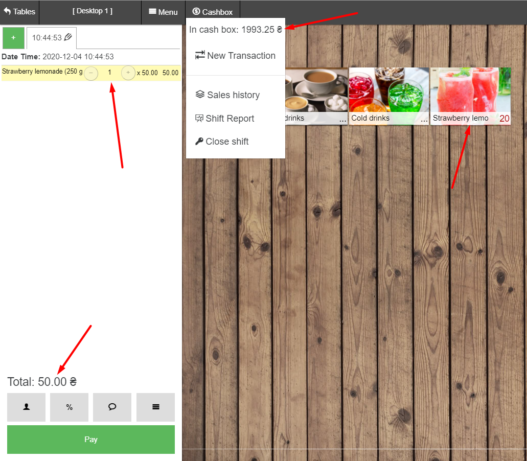 - 在 POS 终端中,转到“厨房”类别,子类别“冷厨房”,单击菜肴并出售“希腊沙拉”。