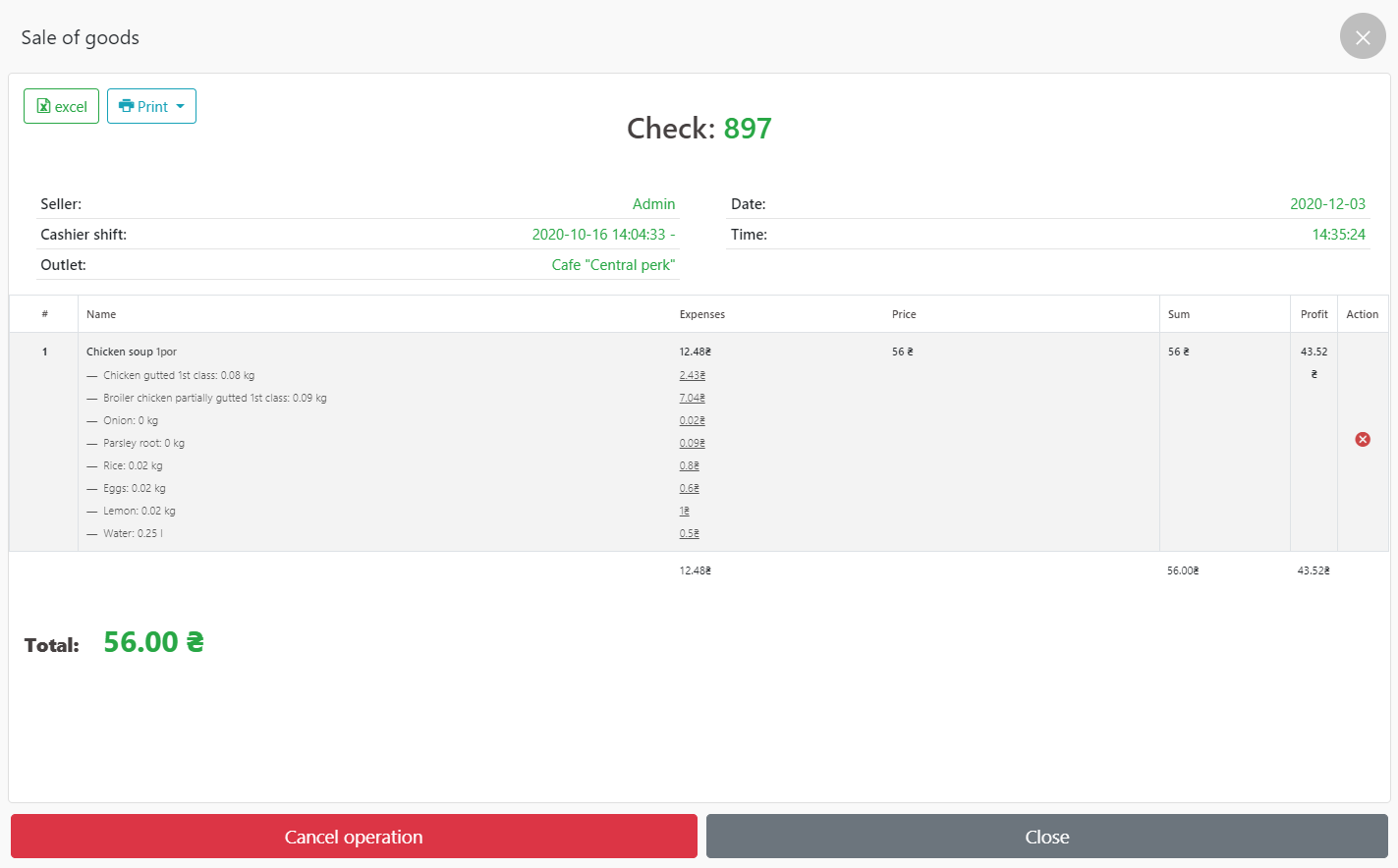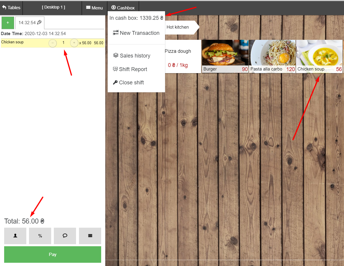 - 在 POS 终端中,我们在“厨房”类别中找到 – 子类别“热厨房”一道菜并出售“鸡汤”