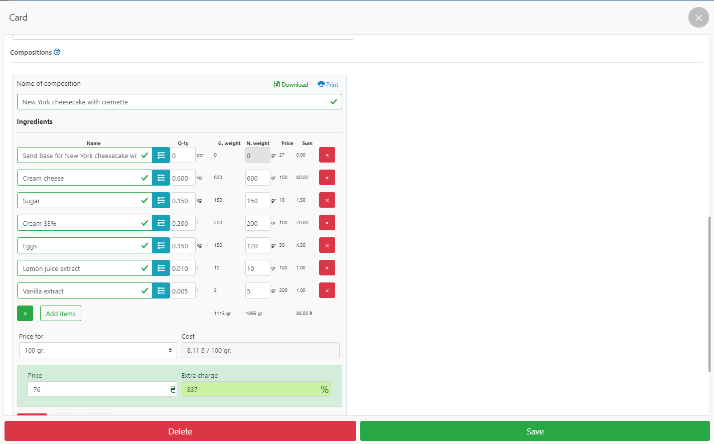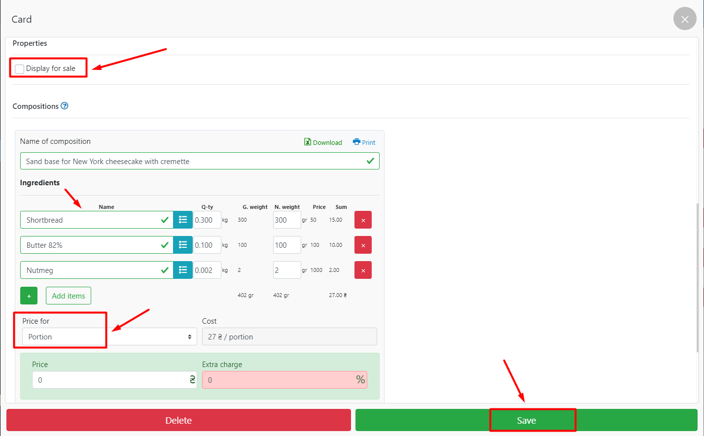 - 这道菜中包含的配料名称(在我们的例子中,“纽约芝士蛋糕配奶油蛋糕”),最重要的是,以克、公斤、升为单位注销的配料的确切数量。