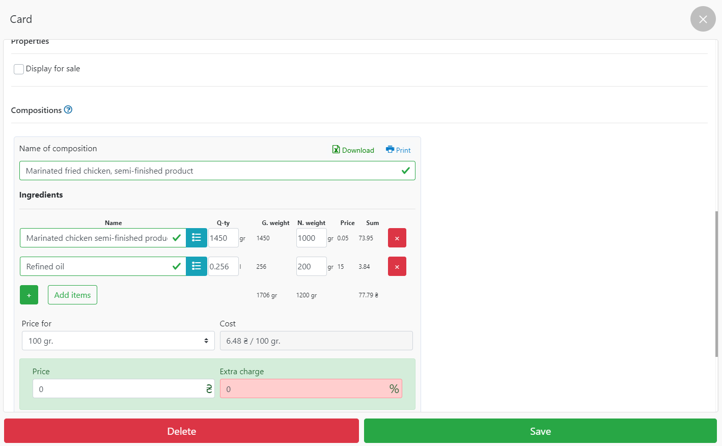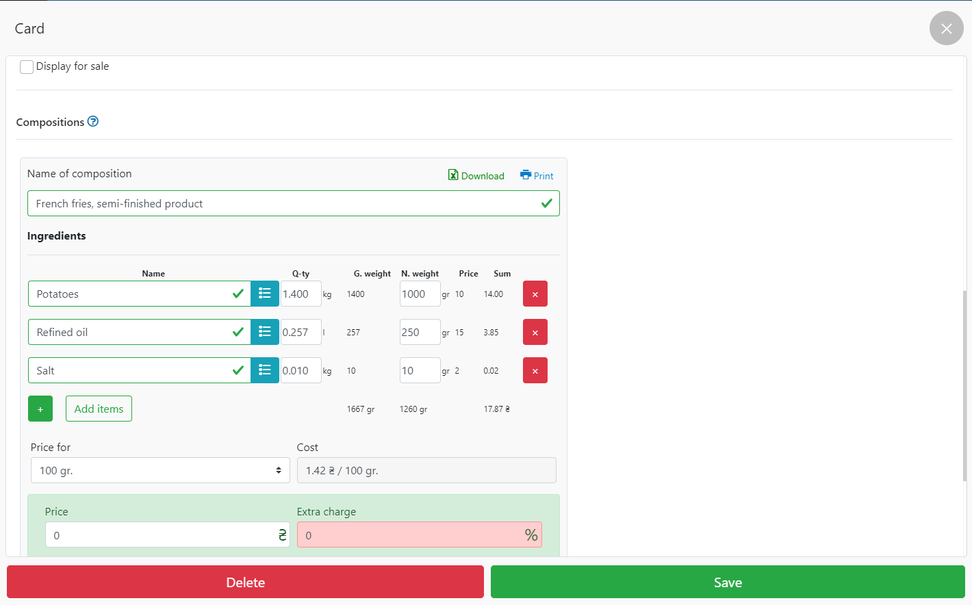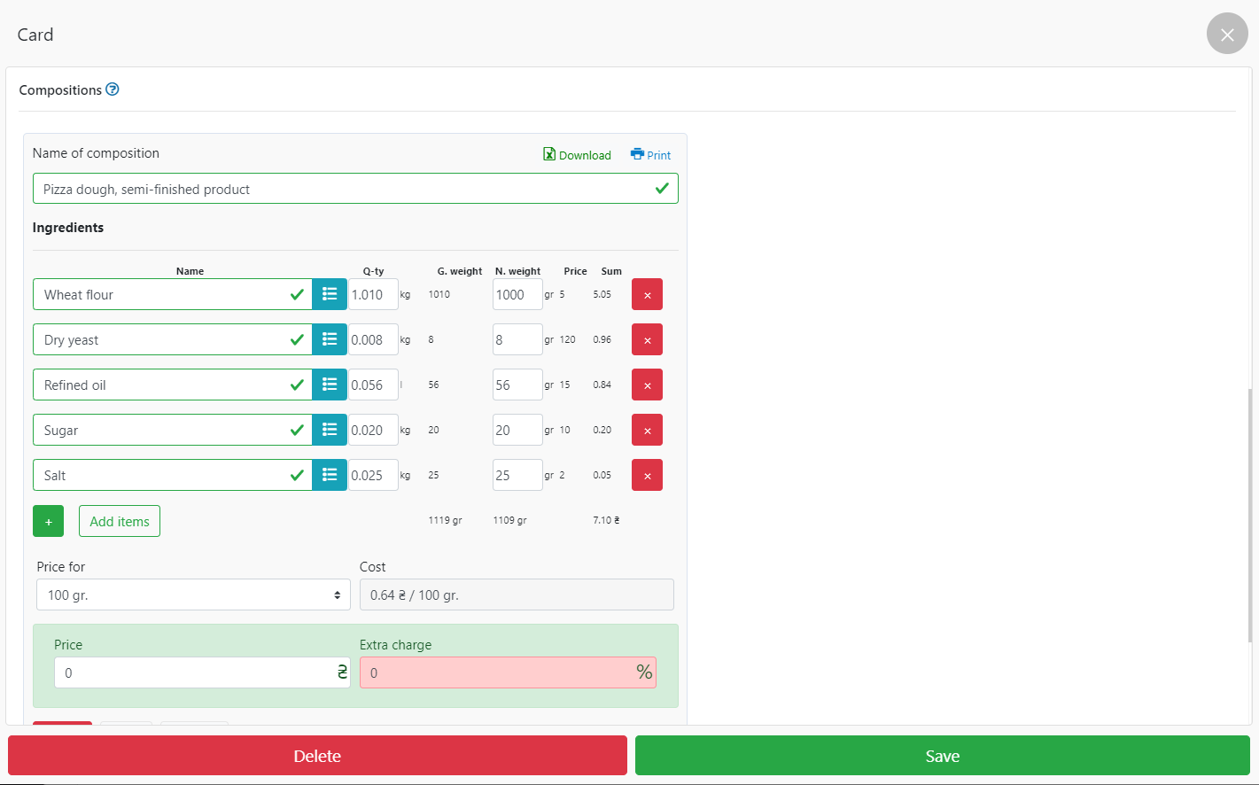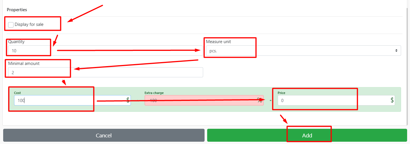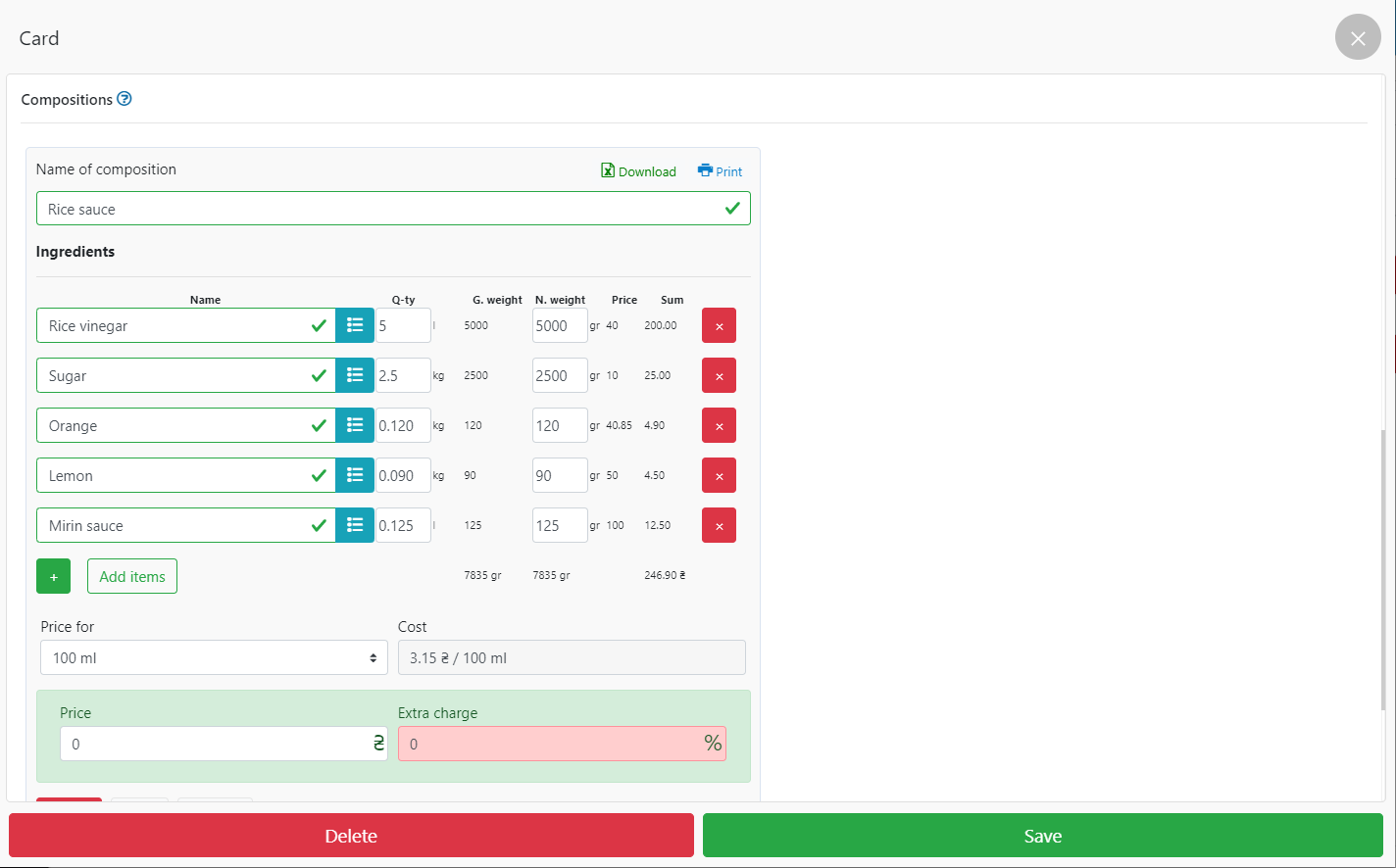 - 当您将原料添加到仓库时,会自动计算成本价和额外费用字段,指示成本价。