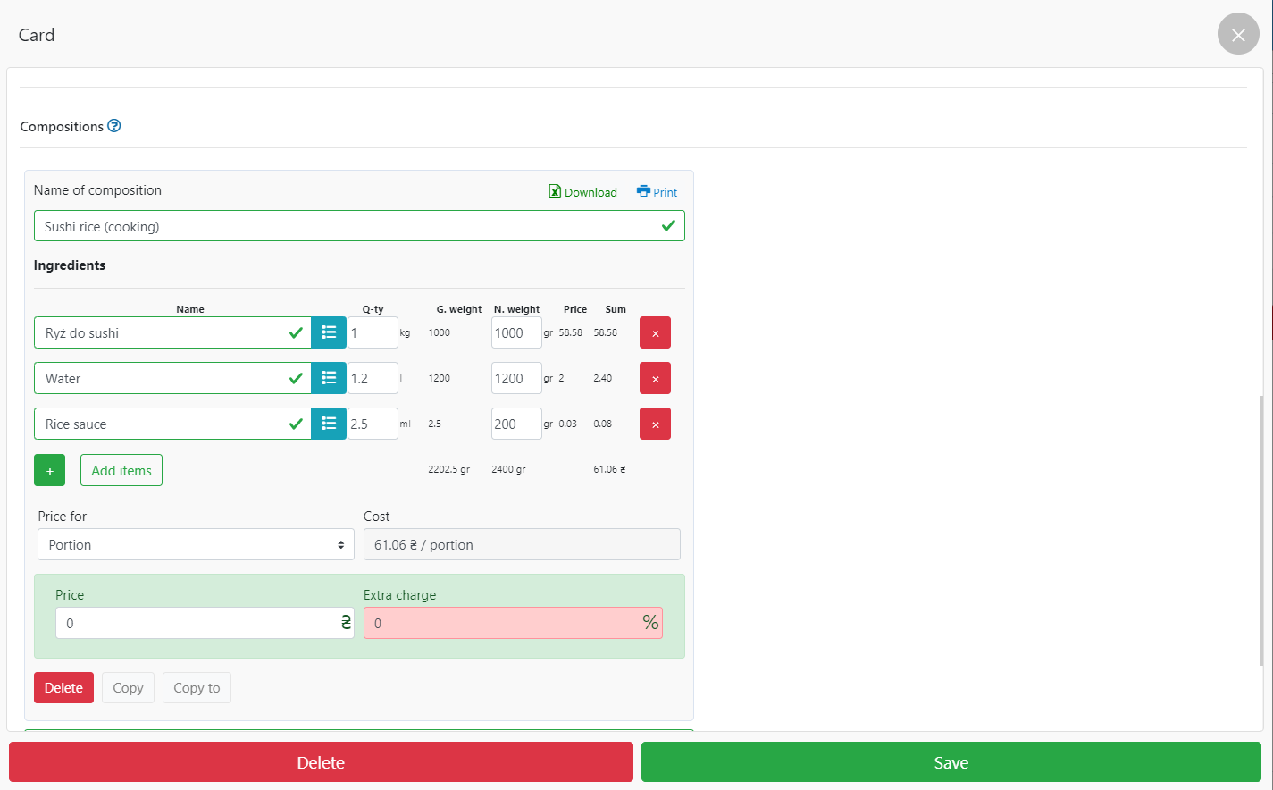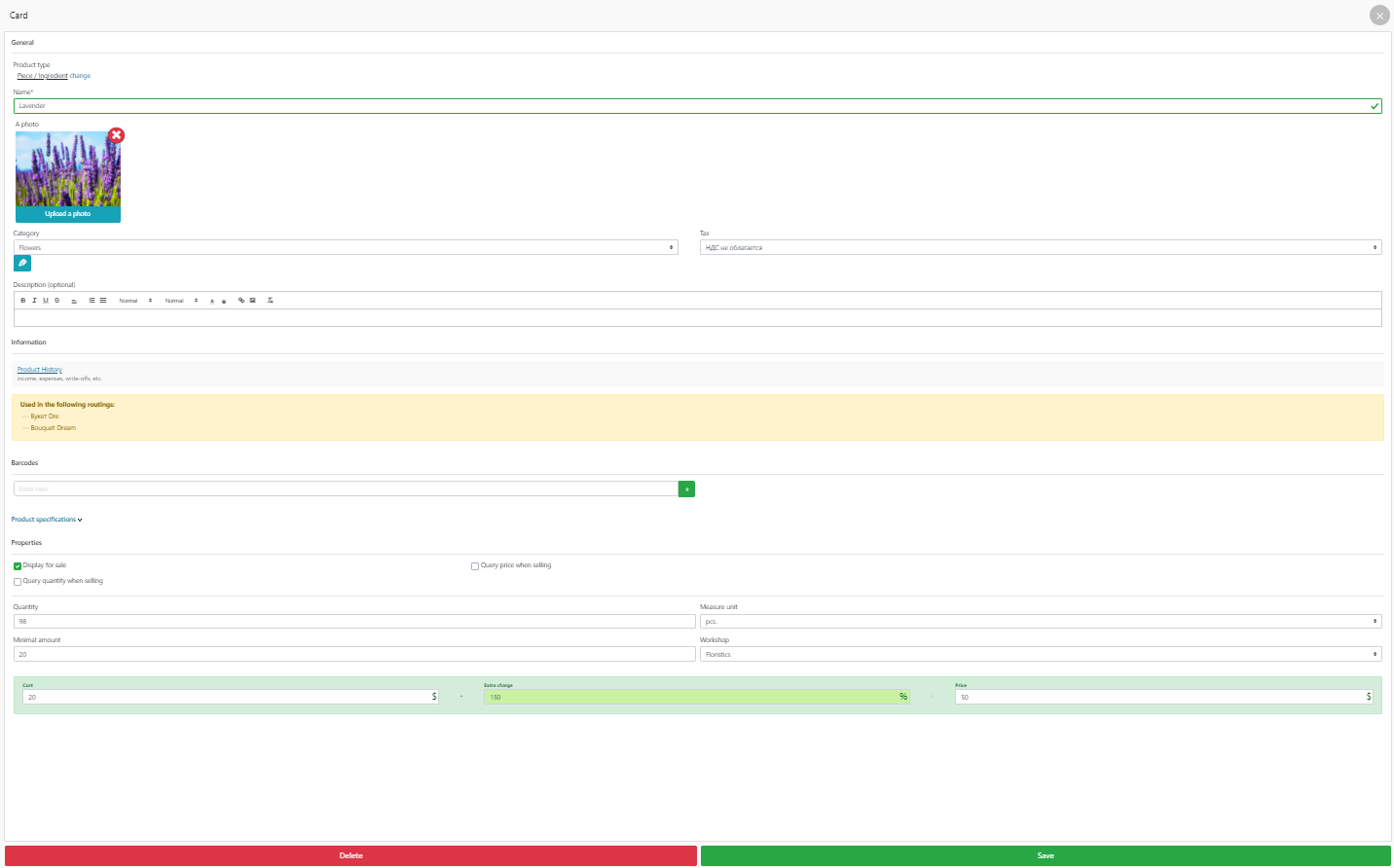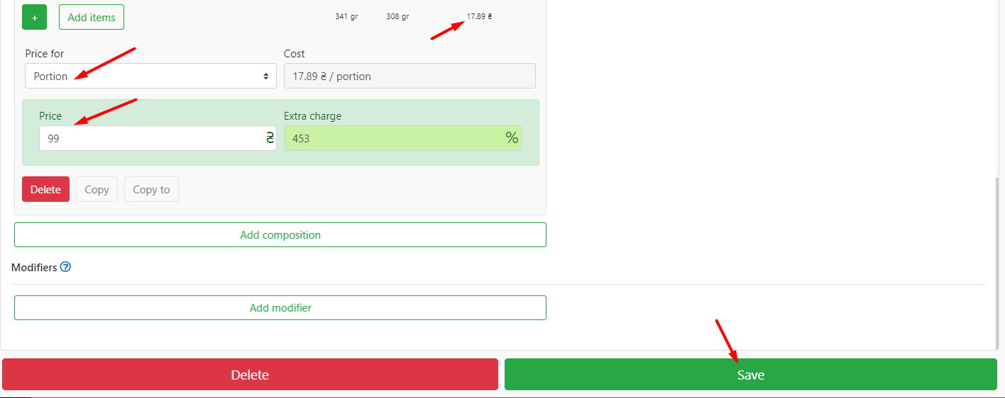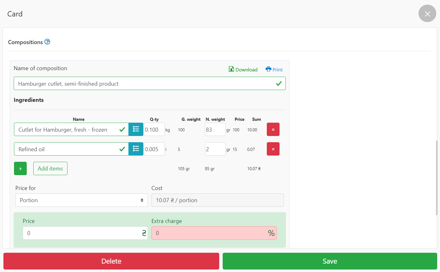 - 当您将原料添加到仓库时,会自动计算成本价和额外费用字段,指示成本价。