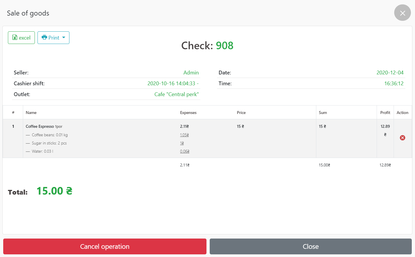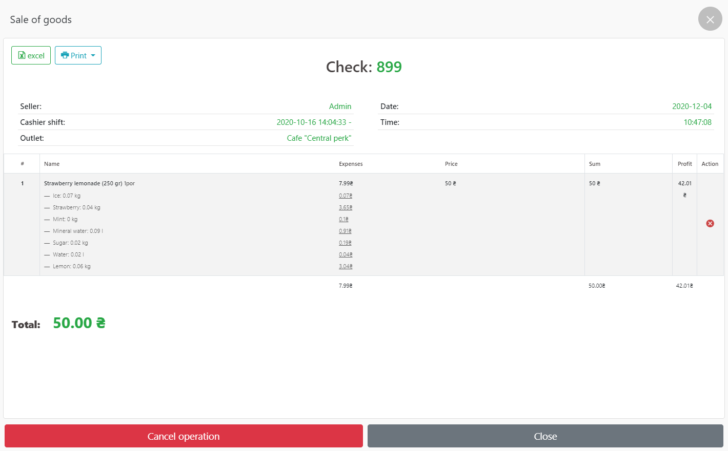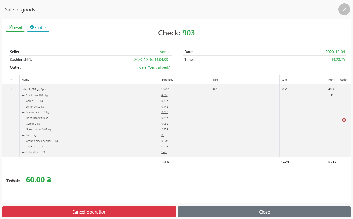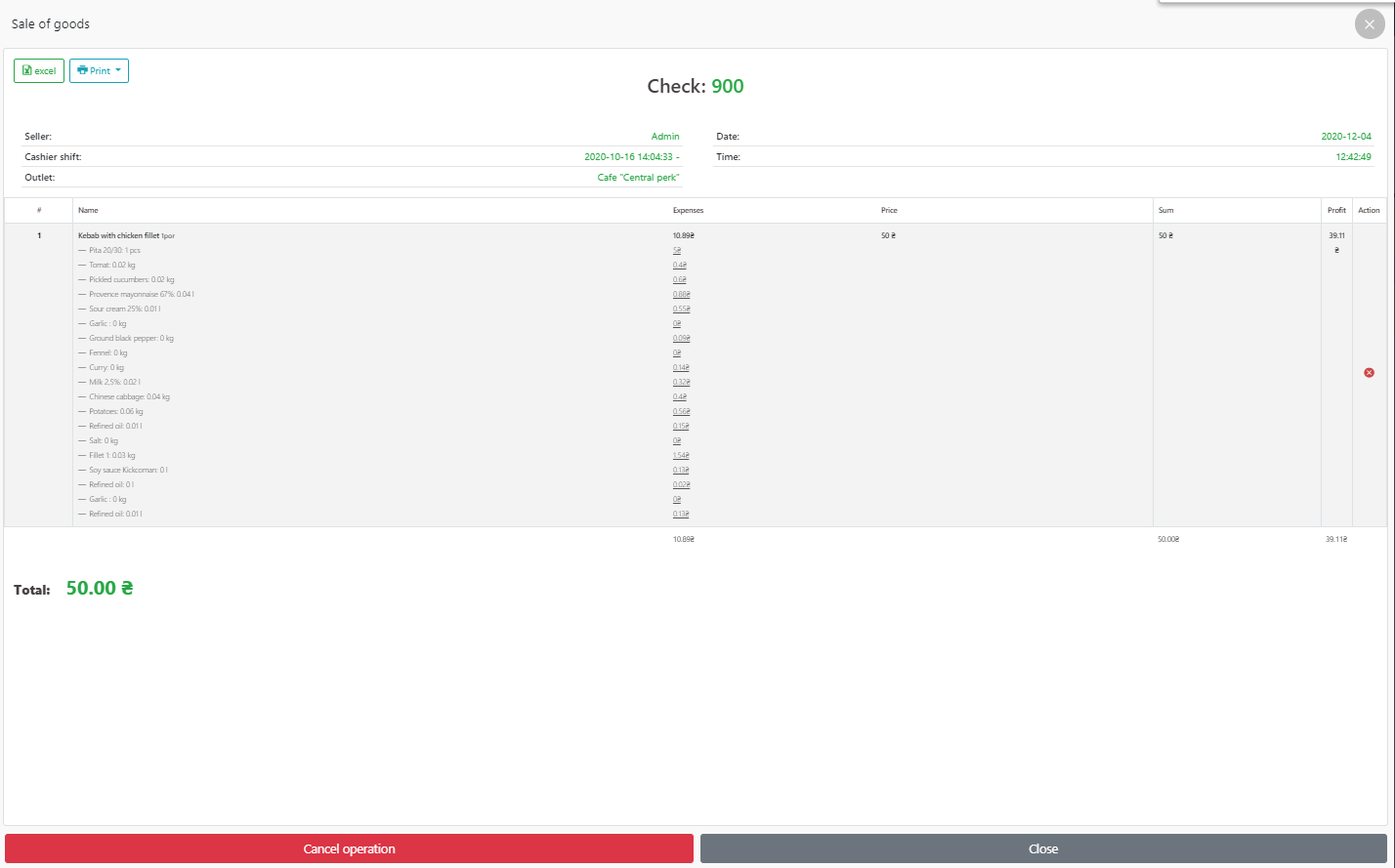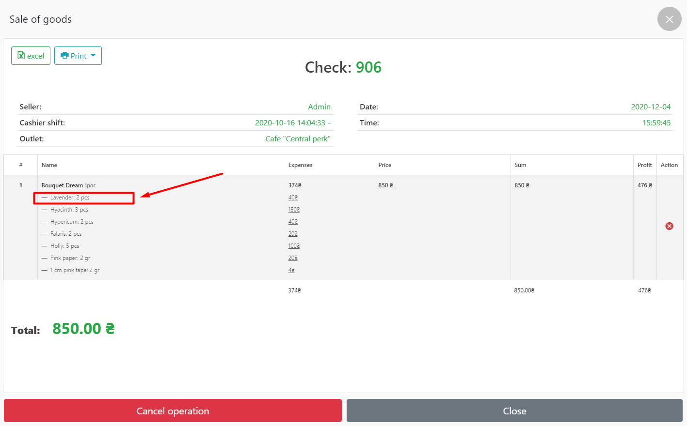 - 我们去 POS 终端 – 钱箱 – 销售历史,选择我们需要的支票,我们可以查看我们需要的关于这次销售的信息。