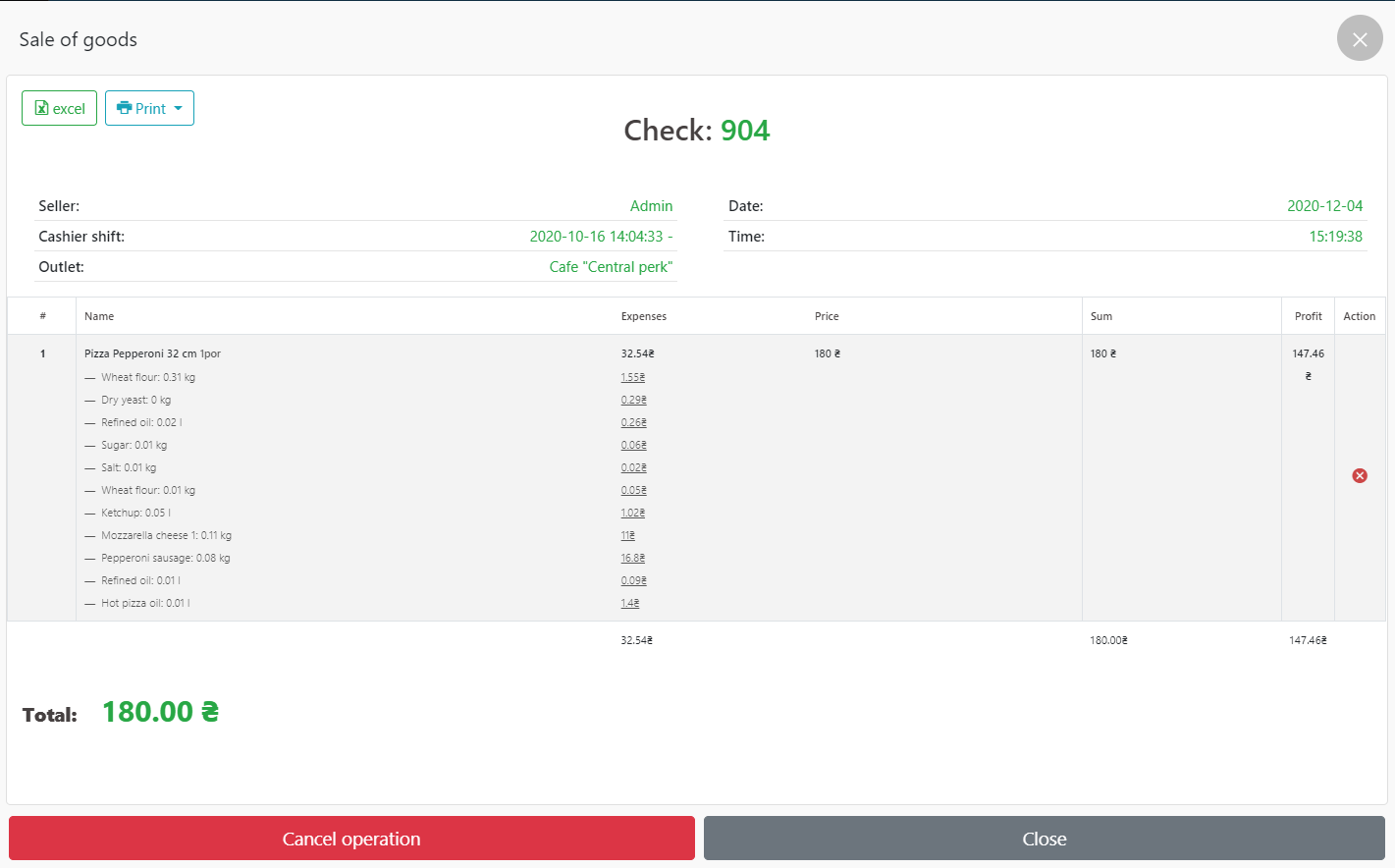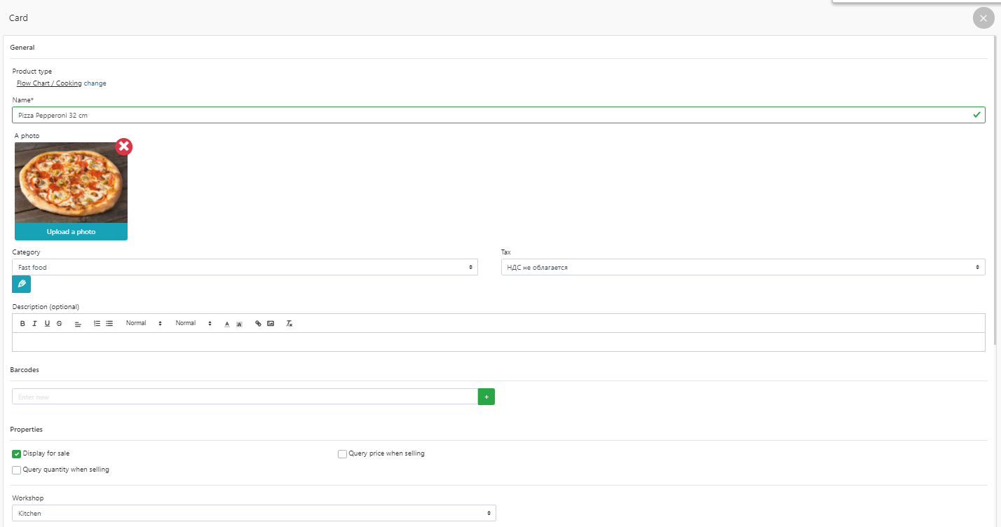 - 在 POS 终端中销售 32 厘米披萨意大利辣香肠的示例