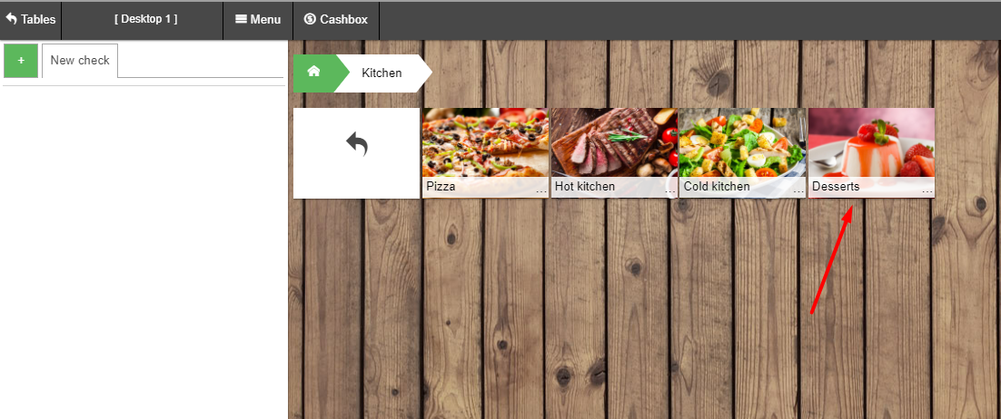 - 我们去 POS 终端,在我们的厨房类别中找到甜点子类别,然后选择我们需要的产品/技术卡