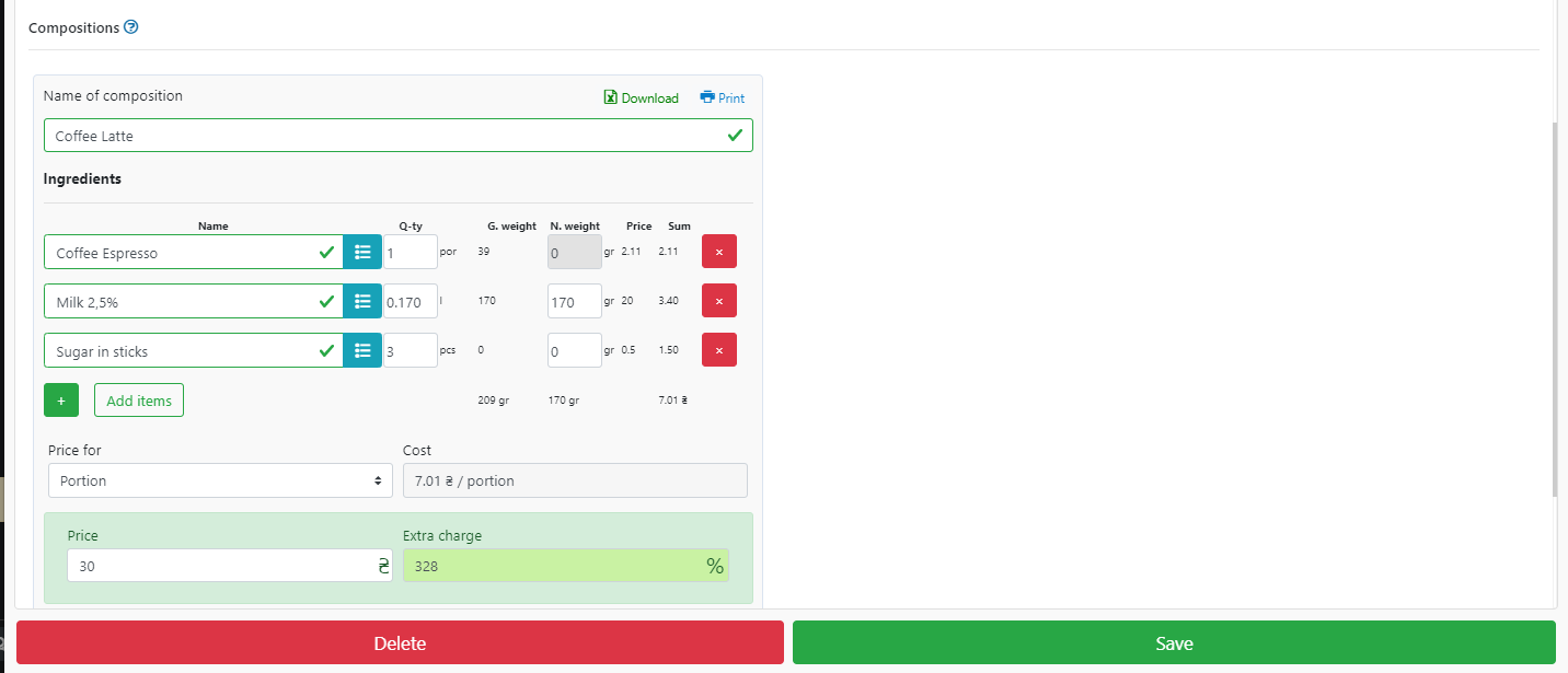 - 这道菜中包含的配料名称(在我们的例子中是拿铁咖啡),最重要的是,以克、公斤、升为单位的配料的确切数量。