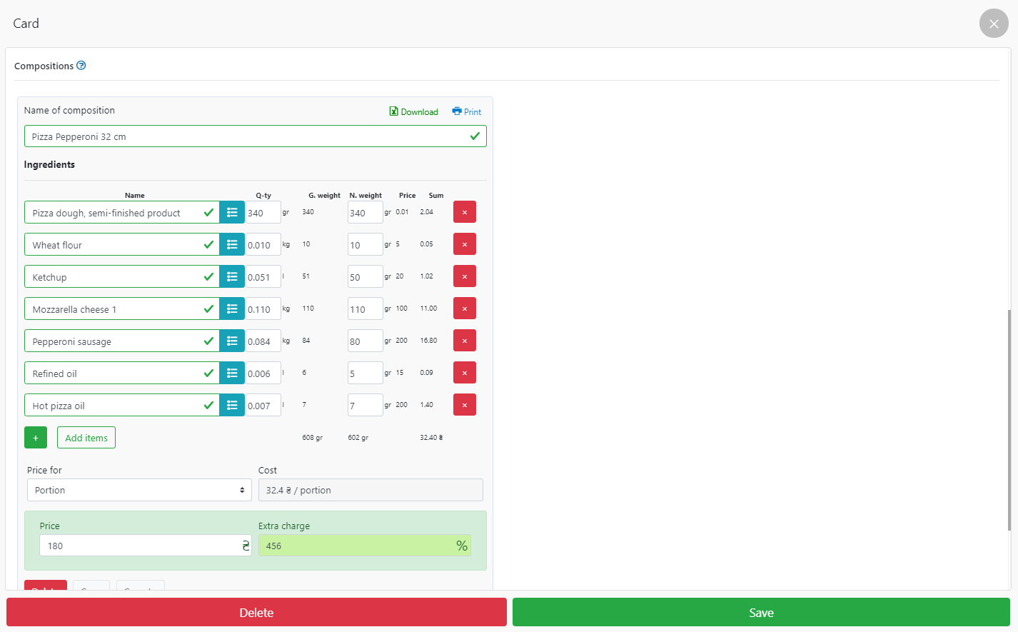 - 这道菜中包含的成分的名称(在我们的例子中,比萨辣香肠 32 厘米),最重要的是,以克、公斤、升为单位注销的成分的确切数量。