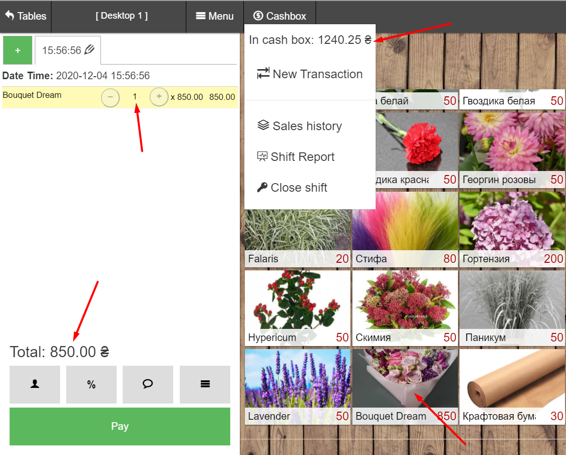 - 在 POS 终端销售 梦幻花束 的示例