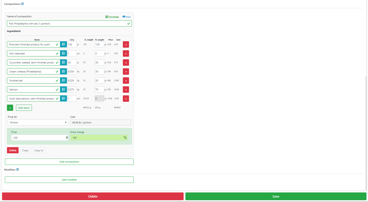 - 这道菜中包含的配料名称(在我们的例子中是“用鳗鱼卷费城”),最重要的是,以克、公斤、升为单位的配料的确切数量。